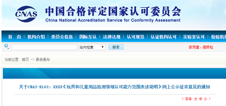 中国合格评定国家认可委员会(CNAS)组织制定了CNAS-EL02:XXXX《玩具和儿童用品检测领域认可能力范围表述说明》。目前已完成文件征求意见稿,现于网上公示征求意见。